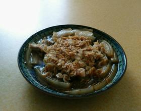 将海米撒在肉片上,加入鸡精少许,淋上生抽