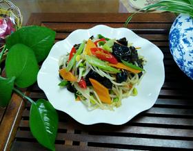 依次下青、红椒、胡萝卜、芹菜、黄豆芽、木耳翻炒。