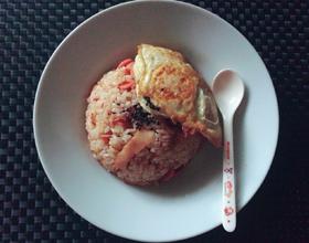 然后加入米饭,按压散开来,继续炒制2分钟即可。