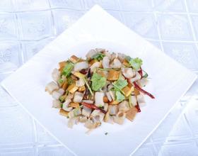 煎盘刷上少许油,放入莲藕丁、香干丁、干辣椒,搅拌一下。