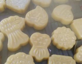 把蒸熟的南瓜倒入糯米粉中加入白糖,蒸熟的南瓜水分多,所以不用加水了,搓成面团,取小部分放在磨具里面,压紧倒出来。