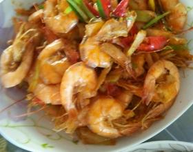 油烧至七成熟,倒入蒜姜,辣椒翻炒,倒入虾,大火翻炒,倒入少许料酒,生抽,加点盐,大火焖