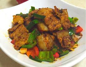 将肉煮十分钟 捞出冷却 切片 青红椒切块 蒜苗大葱切段 姜蒜切片