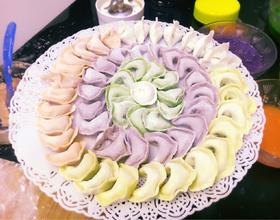 虾煮熟剥好,香菇煮熟剁碎,少许葱花一起辅食机打碎,放入香油搅拌调馅儿。用蒸熟的南瓜,生胡萝卜,青菜,紫衣甘蓝打蔬菜汁用来和面
