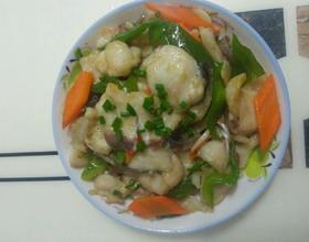 步骤7,油温3-4成热即下鱼片至锅内略有小泡,依次快速放入鱼片后,轻轻晃动平底锅,使鱼片完全浸入油内,鱼片翻炒时尽量要轻,少翻动,不然鱼片就碎了