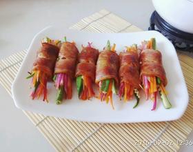 把各色蔬菜条整理好垂直方向放在培根的一端