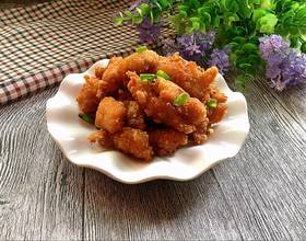 锅中注入玉米油烧至六成热,下沾满面包糠的鸡肉炸制。