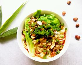 - 7. 煮入面条,面条8成熟时放入青菜,10秒钟后关火,捞起面条和青菜,撒上炒好的肉沫,花生碎和葱花