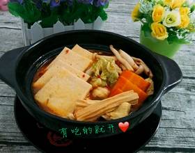 准备自己喜欢的食材(胡萝卜洗净切片,千页豆腐洗净,腐竹提前浸泡好切段,白玉菇择洗净,开水里淖一下水。大白菜择洗干净撕成块)