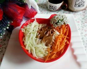 放入萝卜丝和黄瓜丝,芝麻酱。