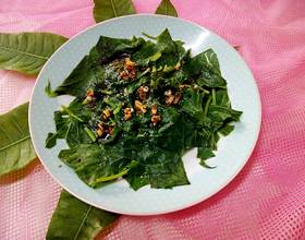 放到篓子里,加椒盐,面粉搅匀,让叶子沾上面粉