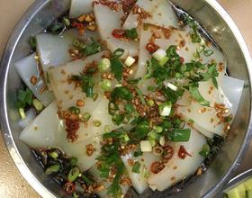 淋汁;把调好的碗料淋在装好盘的凉粉上,撒点葱花,可以开吃了。