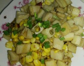 把油倒锅里煎熟后倒入紫姜、蒜、干海椒、花椒翻炒;然后倒入玉米、藕丁;翻炒熟后加入盐起锅。