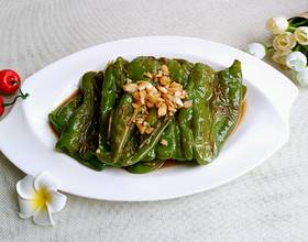 热油锅,将辣椒放入锅中,小火煎的同时用锅铲慢慢压扁,压的时候辣椒会出水,呲呲响,一面煎出虎皮后反面煎,两面都煎好后盛出备用。
