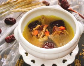 汤开后捞出葱姜,倒入红枣、枸杞连同浸泡的清水一同倒入汤内。