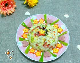 最后加入红肠再翻炒1分钟,就可以出锅了!在炒好的饭上撒少许熟黑芝麻。