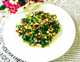 萝卜叶断生后倒入豆干丁,放适量白糖调味