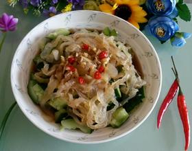 把海蜇放在黄瓜上面,把料汁浇在上面,拌匀即可。