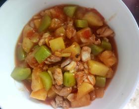 锅里放油下鸡肉炒(记得放姜蒜,我总是会忘记╮(╯▽╰)╭)然后依次放下番茄,菠萝青瓜,最后倒入填好的酱汁,出锅