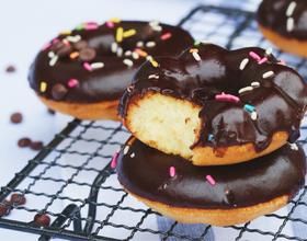 - 13. 将烤好的甜甜圈反扣脱模,一半沾上巧克力酱