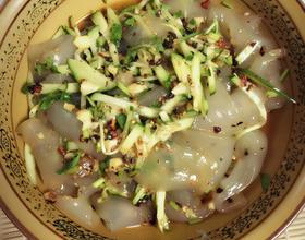 黄瓜切丝、香菜切末,油泼辣子1勺连同准备好的蒜末酱料一起倒入拉皮里搅拌均匀。(油泼辣子因个人口味而定,不喜欢吃的也可以不放)