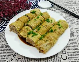 将豆腐皮一切为二,将肉馅铺在百叶上,使每个地方都有肉
