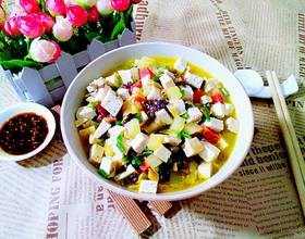 - 3. 把木耳切碎,豆腐切丁,红萝卜切丁,冬瓜切丁,黄花切成小段,一半的韭苔切成小段,放碗里备用。