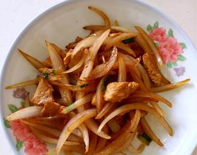 把洋葱倒入锅中翻炒片刻,加入适量的盐,味极鲜和鸡精调味。