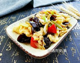 - 3. 蛋液打散;木耳清洗干净;大葱切斜段;红椒切不规则片状