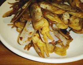 放入蛏子大火迅速翻炒片刻,锅中加一勺酱油,加小半碗料酒,一点白糖。