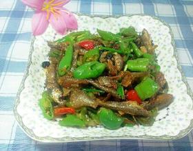 火焙鱼是新鲜的小鱼,放刷油的锅里焙干后,再经过烟熏制而成。已经有八成熟了,不能泡太久,打湿一下(不超过一分钟),泡太软了,炒出来会稀碎的。火焙鱼的最好搭档是青椒,没有韭菜花就不必放了。我是家里栽的香韭菜抽出花了,又香又嫩,市场买的大韭菜花,放二十根就有点多。小鱼小的好吃些。