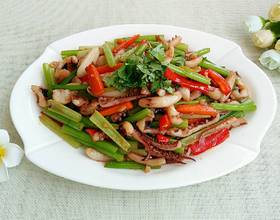 鱿鱼焯水之后基本上已经熟了,所以后面不能炒太久,要不然炒老了口感不好。