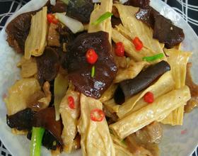 把锅烧热放进花生油,放上姜丝.红辣椒翻炒两下然后放上木耳腐竹爆炒。