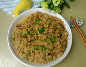 把炒好的猪肉末铺在茄子上面,加入一勺高汤沿锅边淋入盖上锅盖小火焗十分钟。