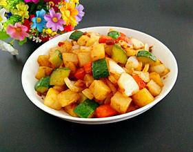 再放入土豆丁和胡萝卜丁翻炒至全部裹住酱汁即可出锅。