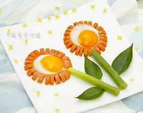 火腿肠切花的时候一定要小心切,以免切断了。鸡蛋选小个的,最好预留出一点蛋清再倒入,要不然就满出来了。摆造型的叶子自己找自家有的合适的就行。煎的时候用小火,油别太多,我用的平底不粘锅煎的。