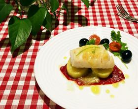 摆盘(红辣椒铺底土豆摆辣椒上再放上煎好的鳕鱼)