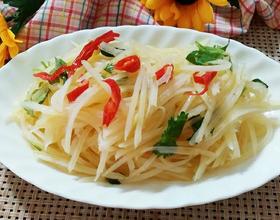土豆丝焯水后马上放入凉水为的是脆,这步不能省去。花椒炸油后一定要用漏勺篦出花椒。