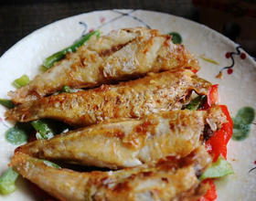 两面煎黄后盛出来余油炒香蒜姜,下煎好的鱼,加适量的开水焖煮片刻,再加入彩椒