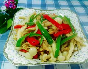 下白玉菇一起翻炒半分钟,加盐,鸡精炒匀。