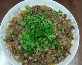 撒上香菜。吃的时候用汤匙连蛋带料一起吃,味道好极了。