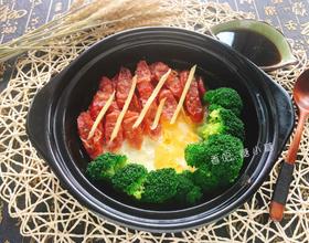 香肠切片、姜洗净切丝、西兰花摘小朵洗净。