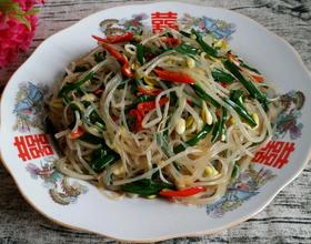 - 5. 把沥过水的黄豆芽,粉丝放一个稍大点的容器中,韭菜切2厘米长小段,红辣椒切丝放上面