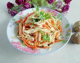 然后,用筷子把鸡脯肉,胡萝卜丝,香菜段,一起拌均匀就可装盘食用了