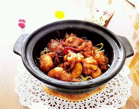 然后倒入绿豆芽上,另起小火焖炒一会,让干锅鸡上少许汤汁入绿豆中关火即可