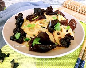 焯好的木耳和藕片过凉水控干水分,一同放入盆中;