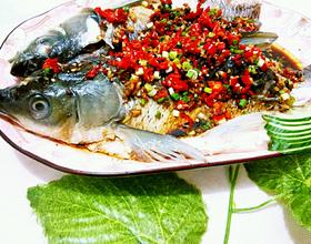 做好的口水汁淋在鱼身上,撒上新鲜的红辣椒末