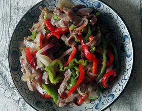 炒锅入油烧热倒入切好片的青红辣椒和洋葱炒香