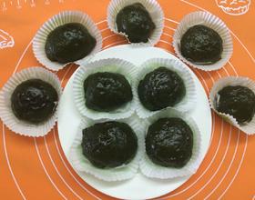 将蒸熟的粉团分成十个小剂子,每个重四十五克,豆沙馅也分十个,每个二十克。