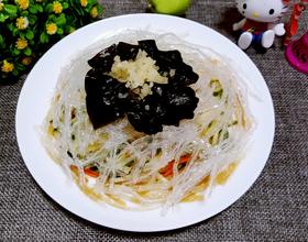 把黄瓜和胡萝卜先放入盘中,冻粉最后放入,把木耳放在最上面装饰一下!放上姜末!美美的!
